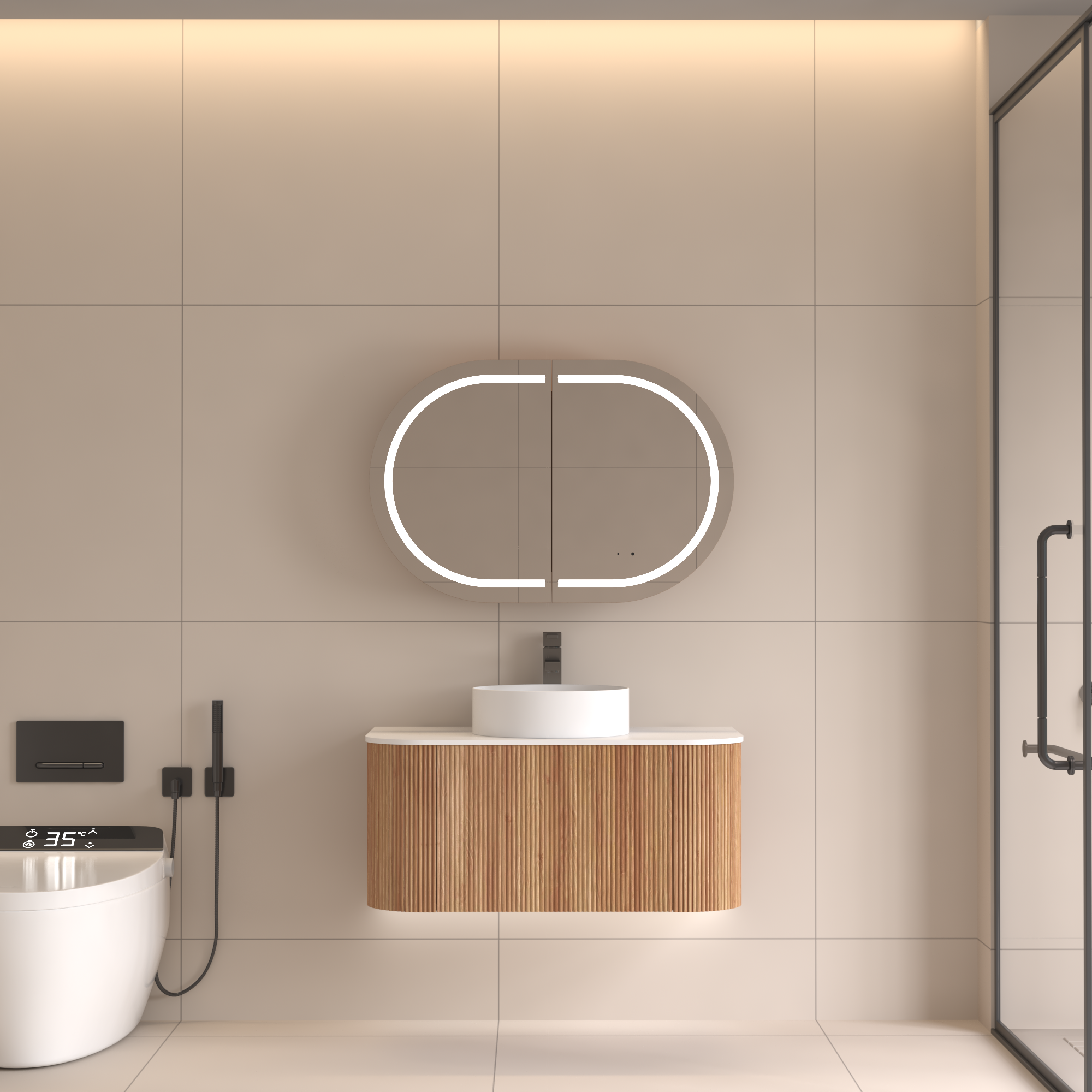 ELLURA 900(W)x600(H)mm Front-Lit LED Mirror Cabinet with Sensor & Demister – Acacia