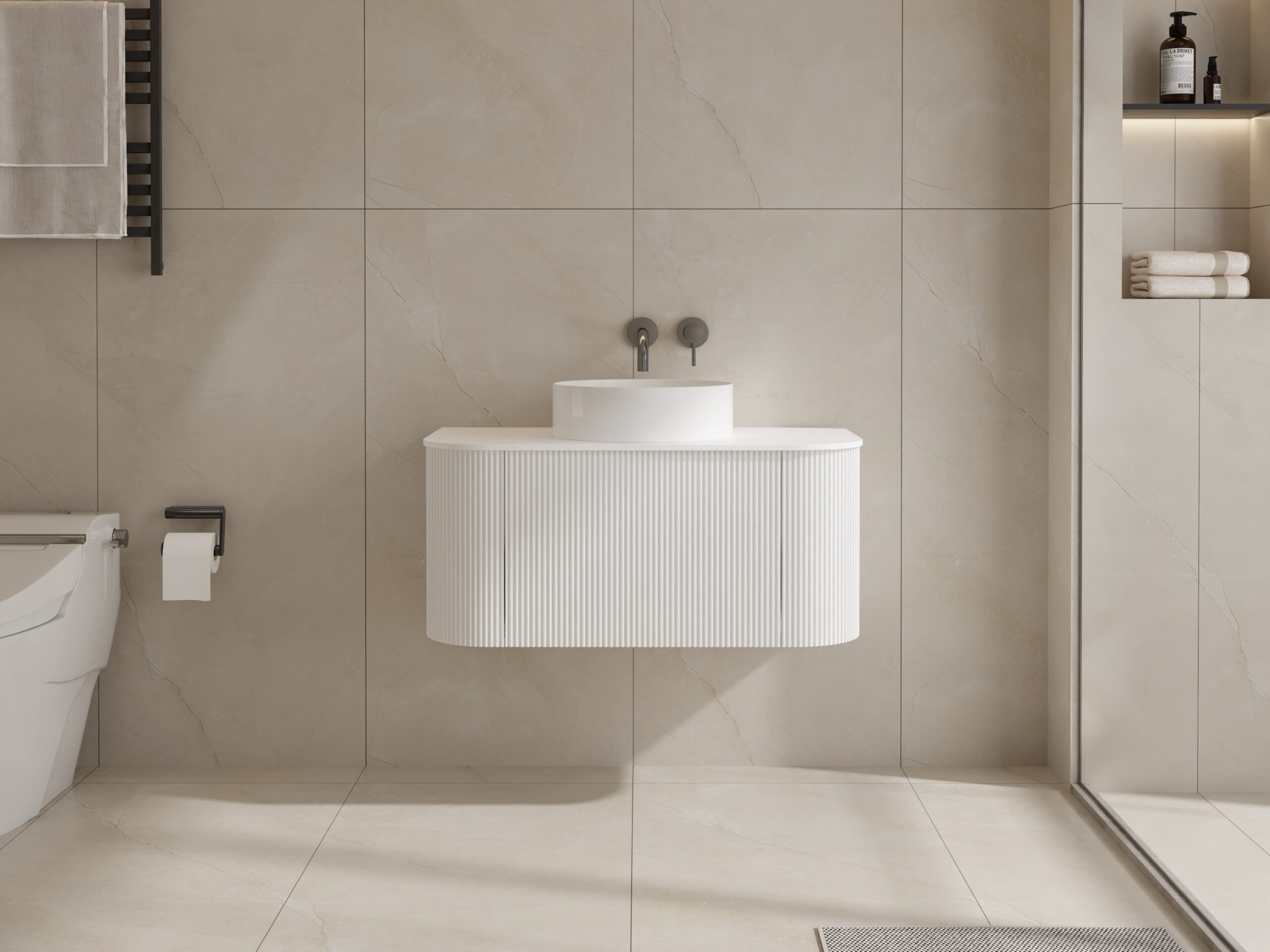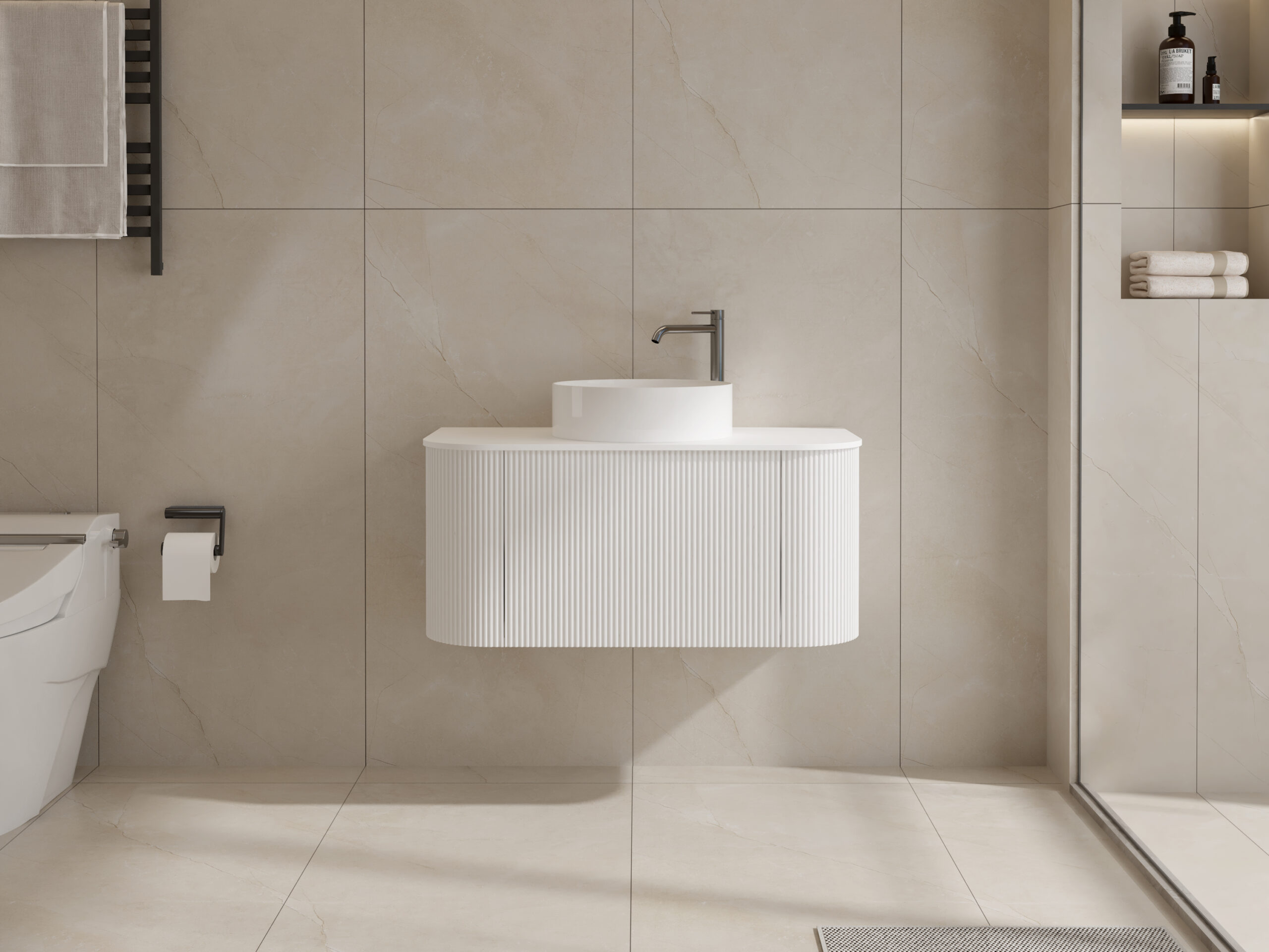 A 900mm vanity is best suited for medium-sized bathrooms ranging between 2m and 3m wide and ideal for a small family of 3 to 4 members. To ensure a comfortable layout, allow enough space for movement and door clearance. If you prefer a sleek, space-saving option, a wall-hung vanity is ideal, while a floor-standing vanity offers additional storage for a more functional setup.