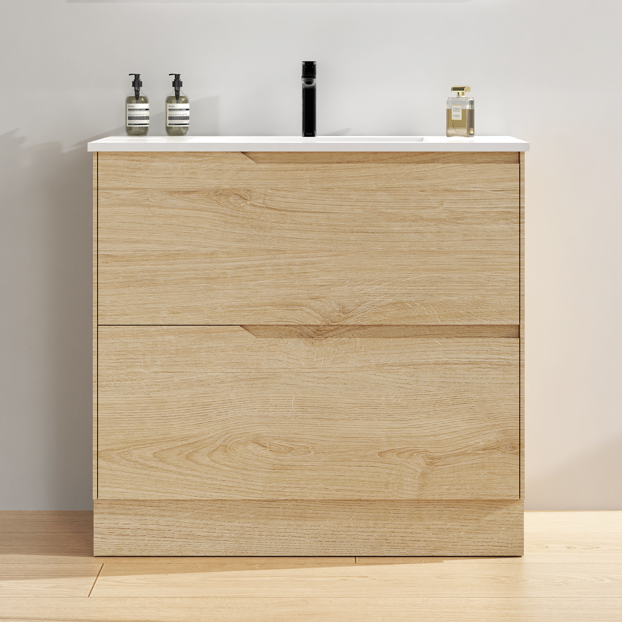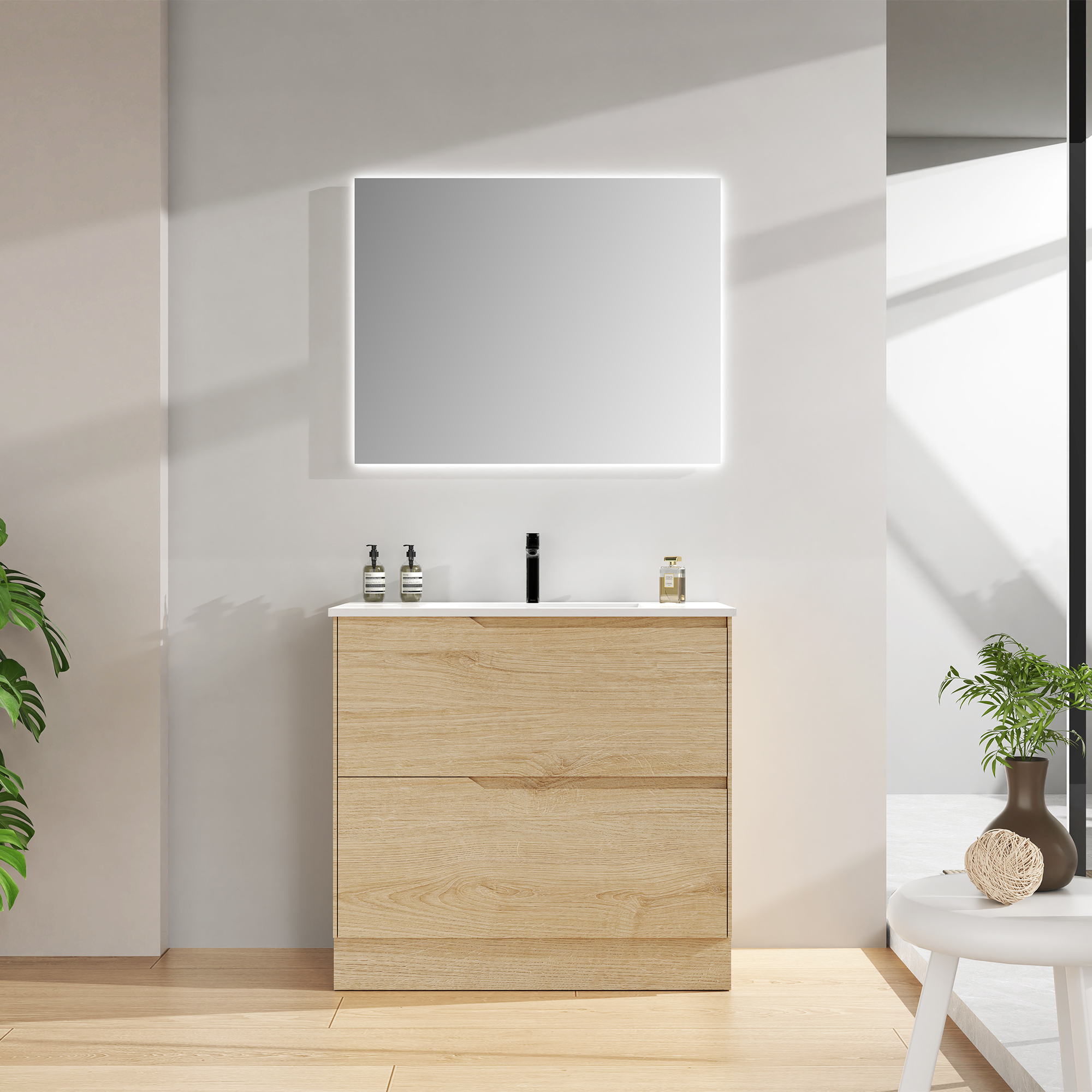 Our floor-standing vanities offer generous storage space, allowing you to organize your towels, toiletries, and bathroom accessories with ease. The full base design adds visual stability while eliminating the need for extra storage furniture, helping you maintain a clutter-free bathroom.