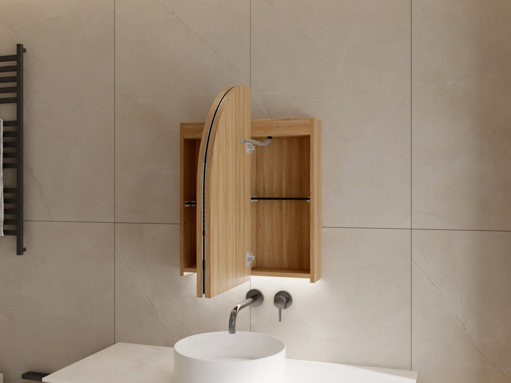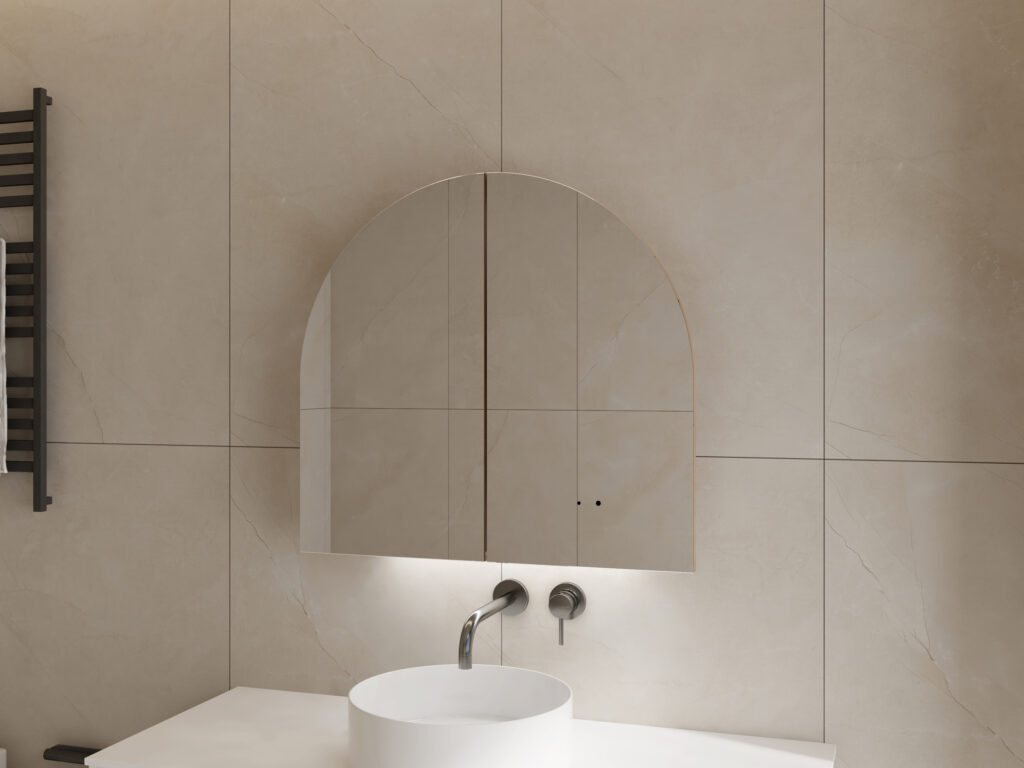 The gracefully arched mirrored doors are enhanced with subtle bottom LED illumination, casting a soft ambient glow that elevates your bathroom atmosphere while providing practical lighting for daily routines. Gesture-controlled motion sensors allow touch-free activation of both the lighting and built-in demisters, keeping the mirrored surface clear and fingerprint-free. Each door is fitted with its own demister pad, ensuring fog-free reflections even in steamy conditions, with an automatic 1-hour shutoff for efficiency.