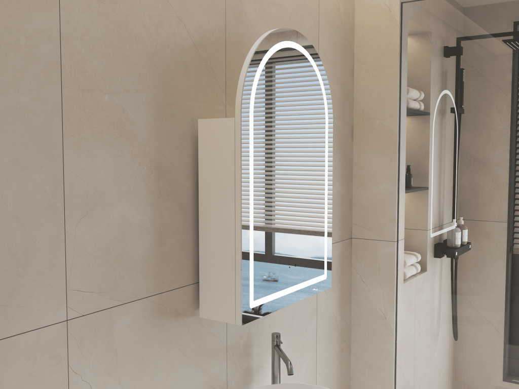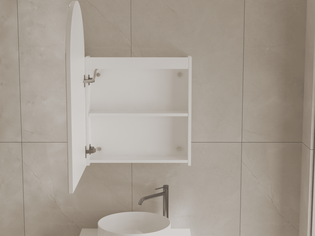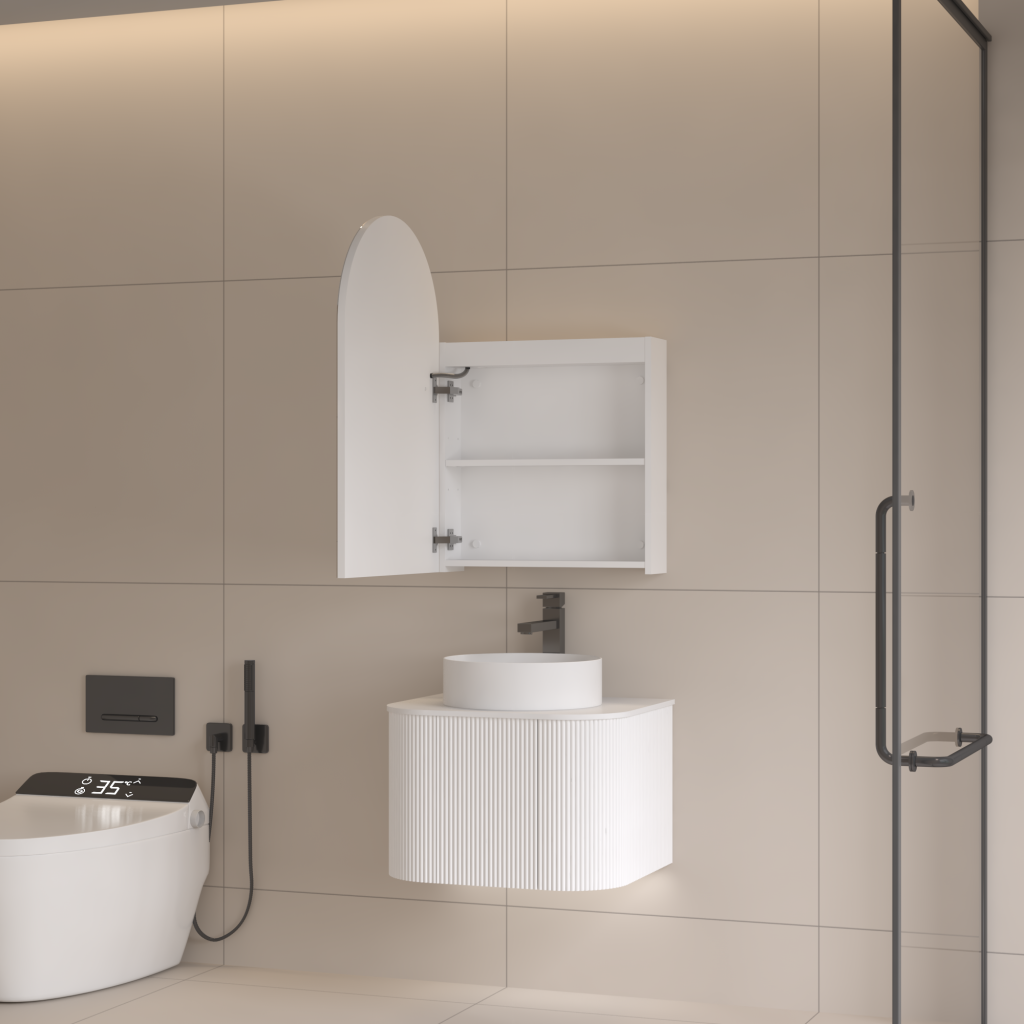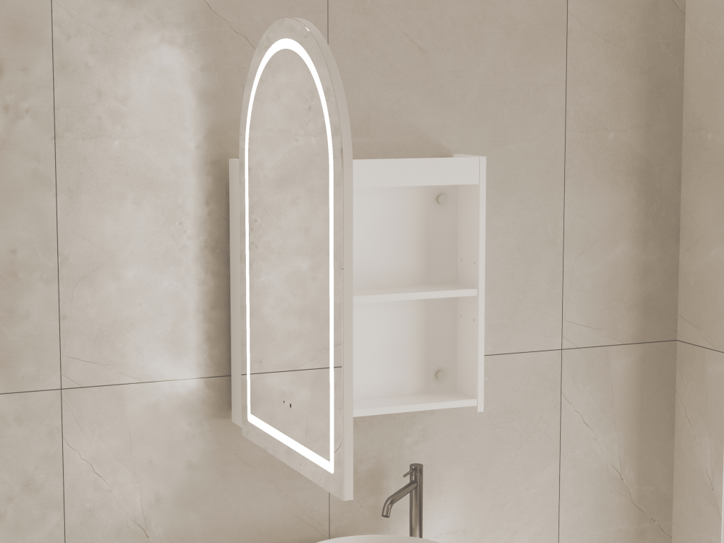 Elevate your bathroom with the ARIA 550mm Front-Lit Arch Cabinet with Sensor & Demister – Matte White Finish, a contemporary storage solution that blends elegant curved design with modern functionality. Crafted from premium plywood and finished in sleek matte white, the ARIA cabinet delivers both refined style and everyday practicality. Its gracefully arched mirror front is enhanced with integrated front-facing LED lighting, producing bright, even illumination that’s perfect for makeup, shaving, and grooming. The LED strip sits subtly within the mirror surface, ensuring clear visibility while creating a soft, inviting glow that enhances your bathroom atmosphere.
