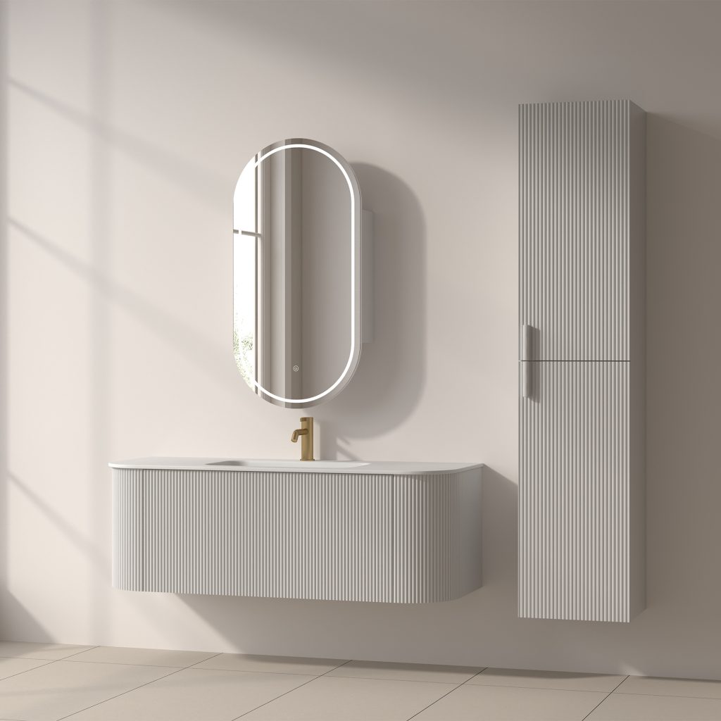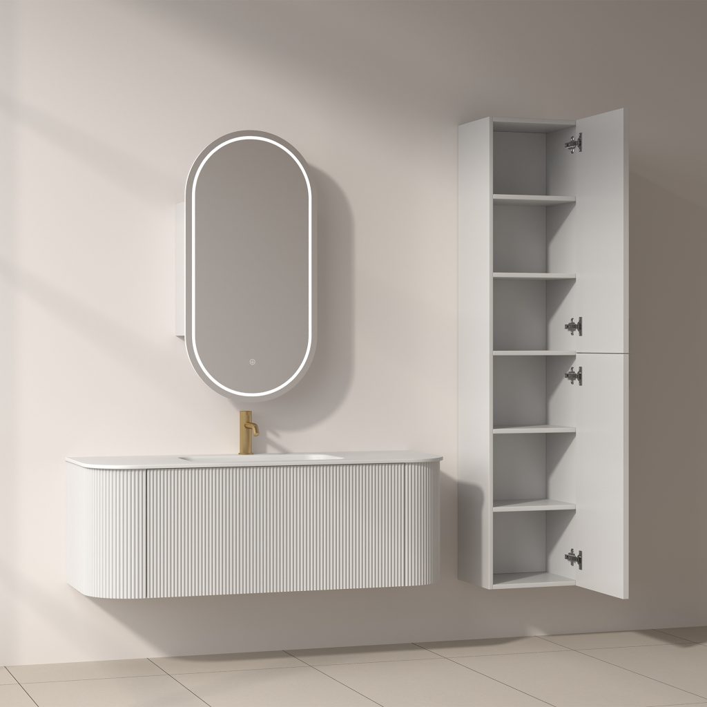 Bring high-end architectural style and incredible storage capacity to your bathroom with the Aura Wall-Hung Towel Cabinet. Designed to perfectly complement fluted vanities, this towering side cabinet features a beautifully ribbed Matte White facade. Standing at 1600mm tall, it provides the ultimate clutter-clearing solution for towels, cosmetics, and bathroom essentials while maintaining a sleek, modern, floating aesthetic.