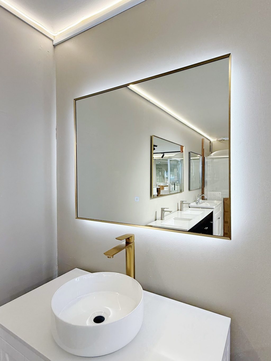 - Model: LINA Framed Rectangle Back-Lit LED Mirror – Brushed Gold