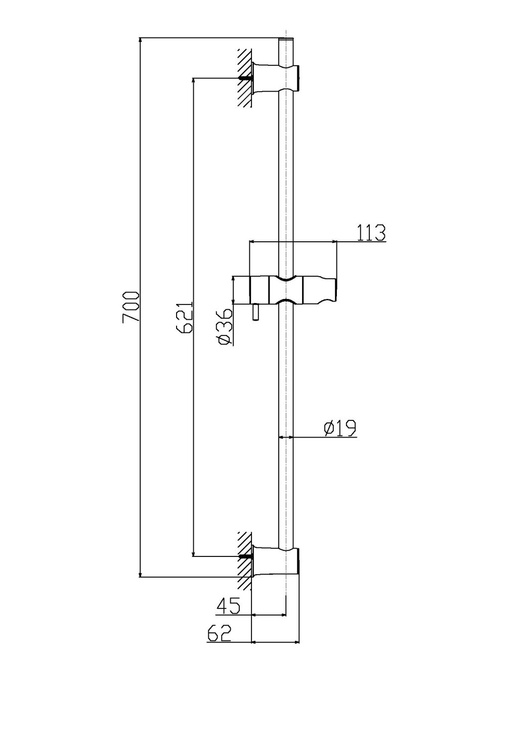 Flexible rail installation rail with adjustable wall mounting brackets for retro-fit to existing installation holes. Suitable for hole spacing a maximum of 621mm.