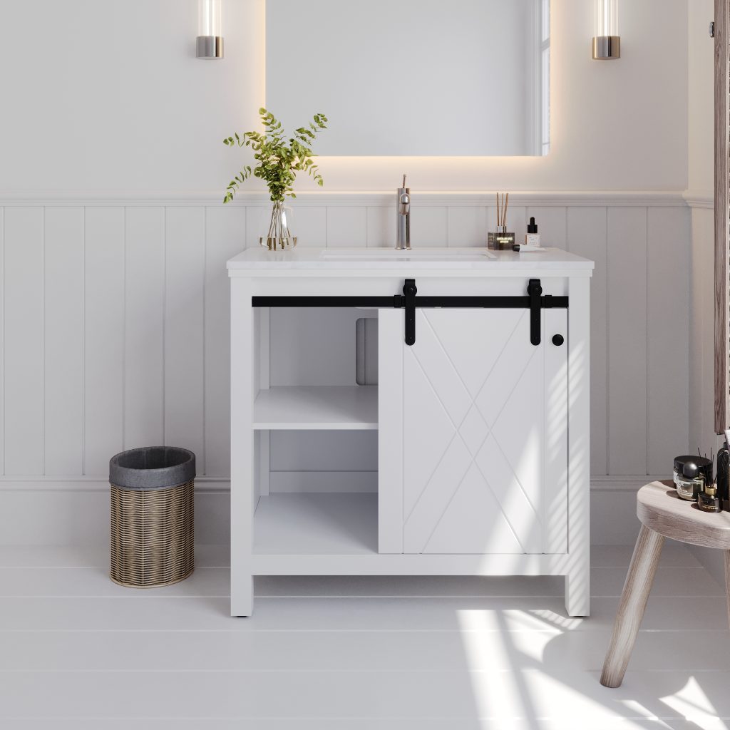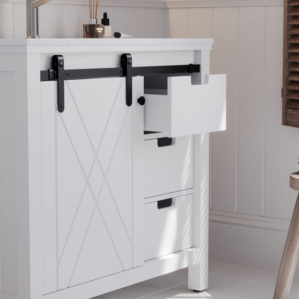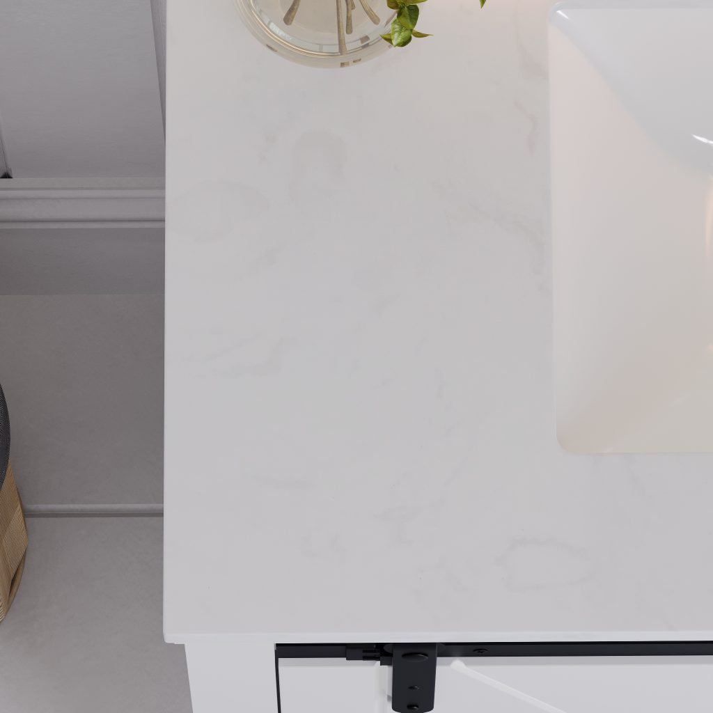 A natural white marble top with a ceramic basin adds elegance, while the unique sliding barn door with soft-close hardware brings character and ease of use. Ample internal storage ensures a clutter-free bathroom, and soft-closing drawers and doors provide a smooth, silent operation.