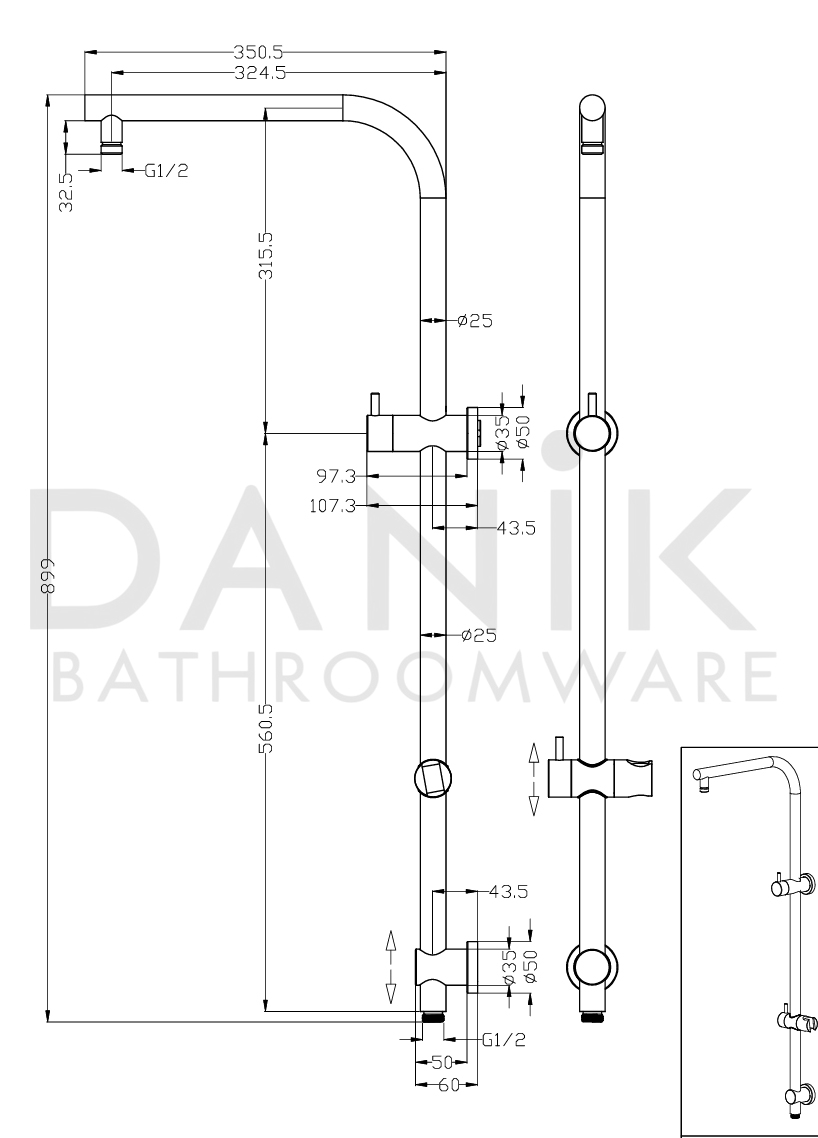 - Shower Arm Reach: 324.5mm (from wall to center of rainfall head)