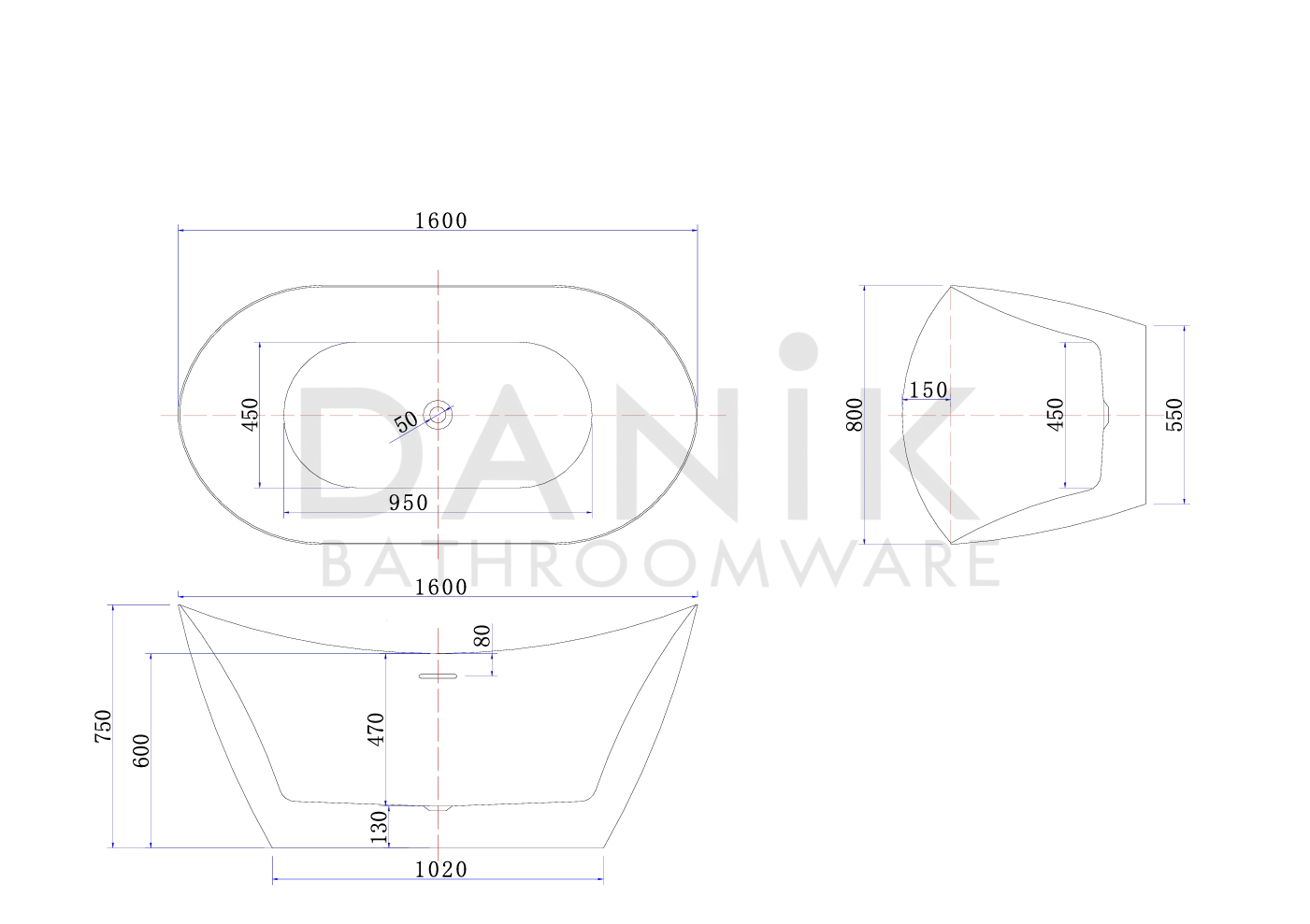 - Dimensions: 1600mm (L) x 800mm (W) x 750mm (H – at ends).