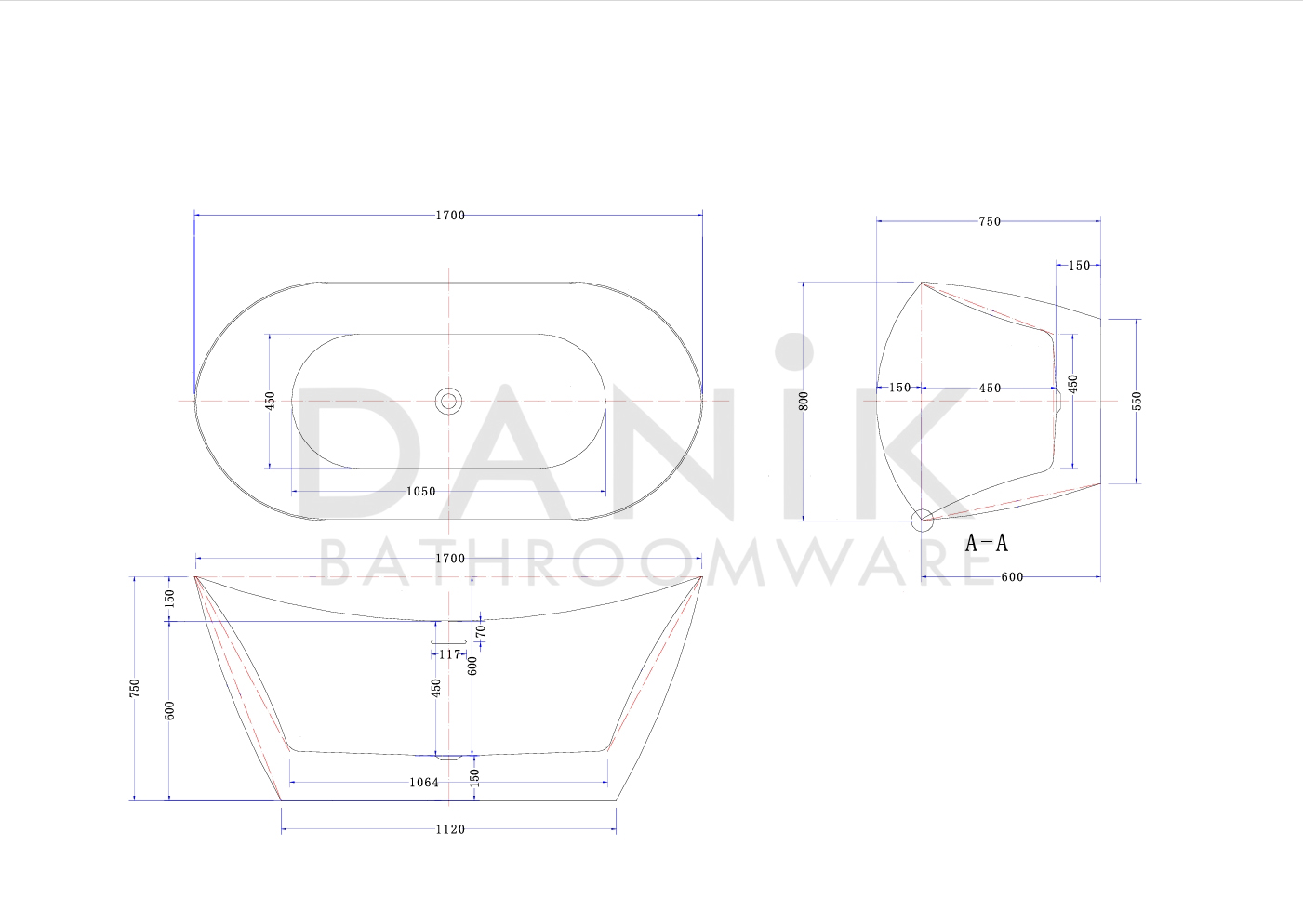 Dimensions: 1700mm (L) x 800mm (W) x 750mm (H – at ends). - Center Height: 600mm.