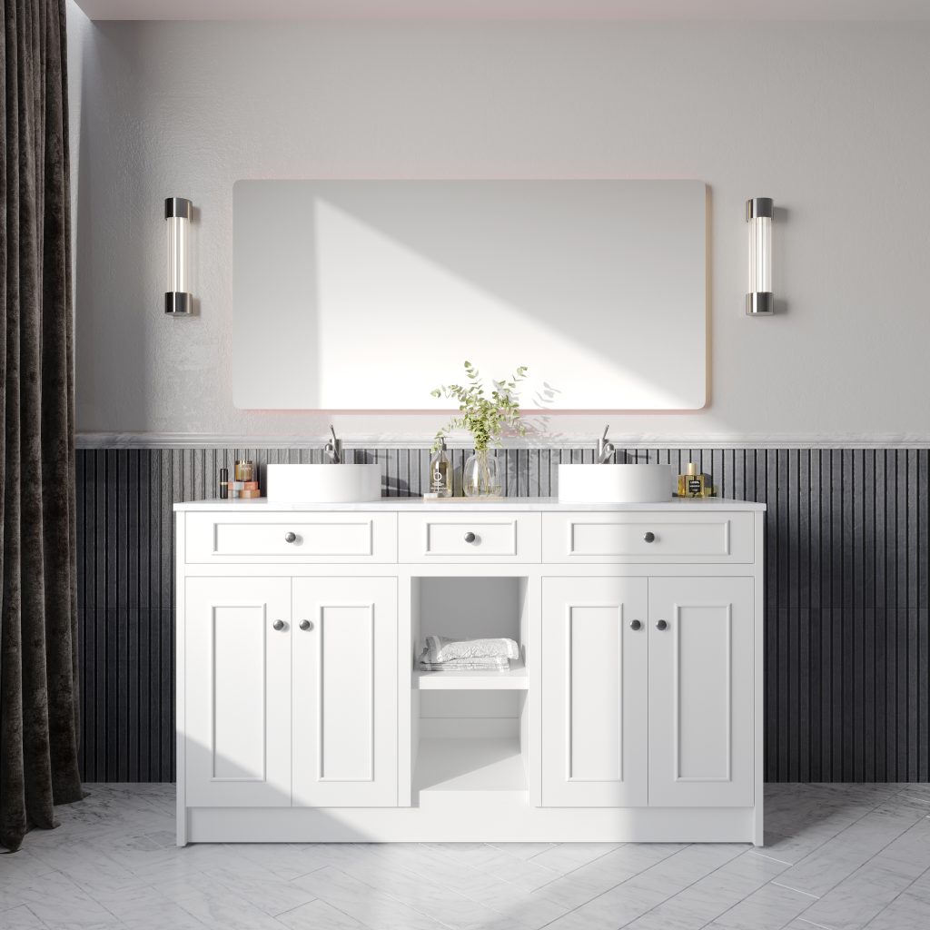 - Luxury Stone Top: Natural quartz countertop paired with either dual ceramic under-mounted basins or two vessel basins. Each quartz surface is unique, showcasing natural variations that enhance its character.