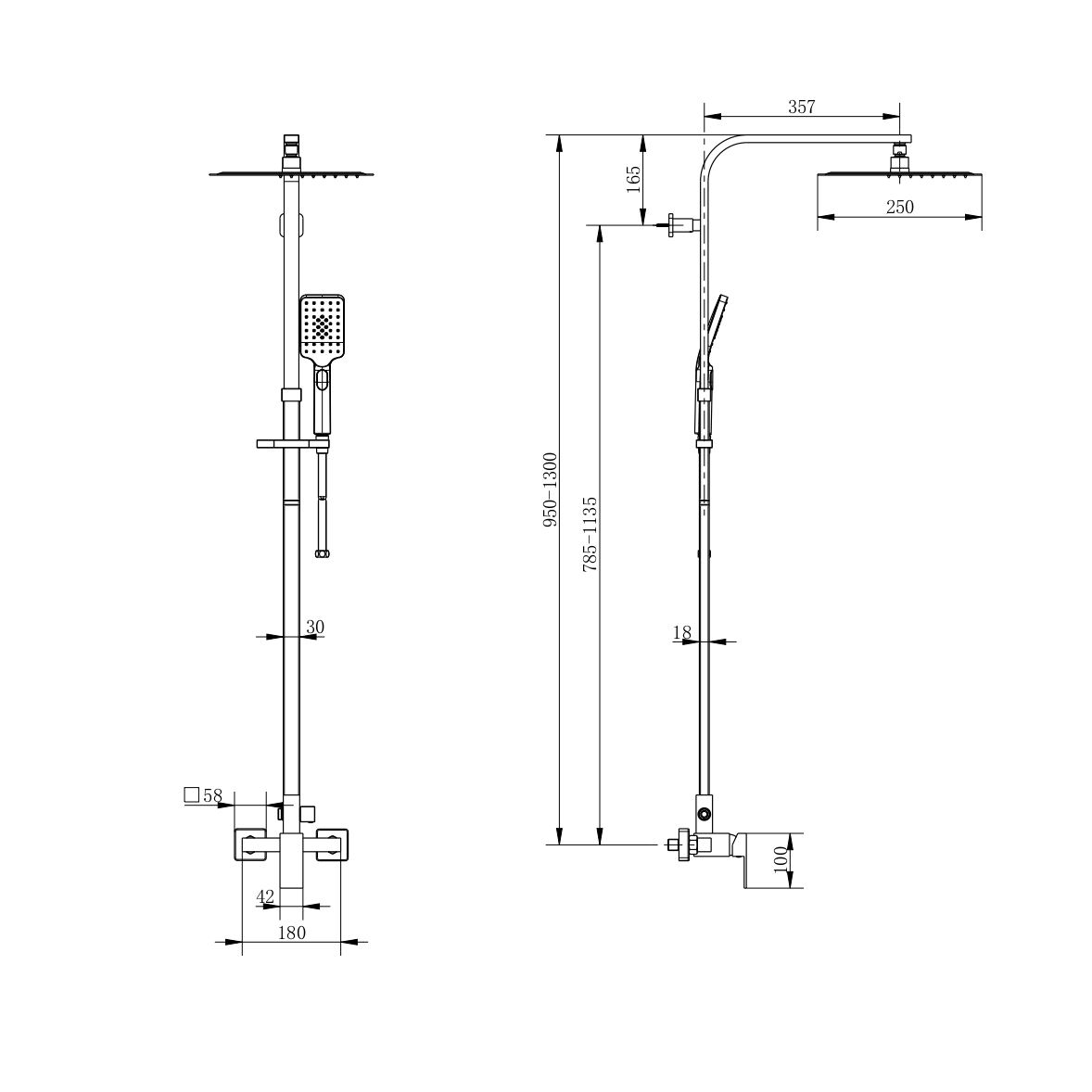 - Overall Adjustable Height: 950mm – 1300mm (From mixer inlets to top of the shower arm)