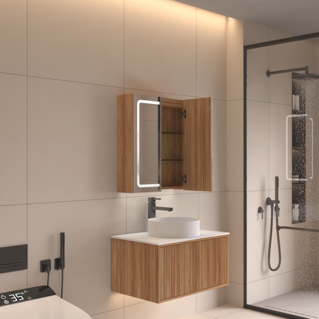Lumina 600mm Front & Bottom-Lit LED Mirror Cabinet with Sensor & Demister – Acacia