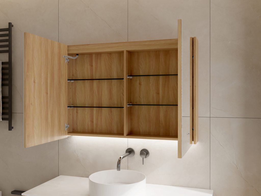 Equipped with a gesture-controlled sensor, the cabinet allows you to activate both lighting and built-in demisters with a simple wave of your hand—keeping the surface smudge-free. Each mirrored door has its own demister pad, ensuring clear reflections even in steamy conditions. For energy efficiency and safety, the demisters automatically power down after one hour.