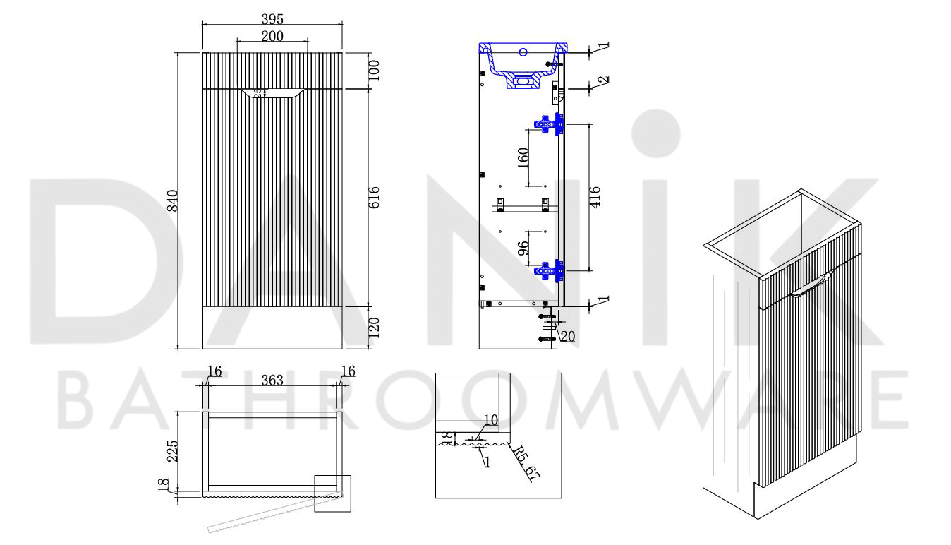Dimensions: 395mm (W) × 240mm (D) × 840mm (H) (without basin)