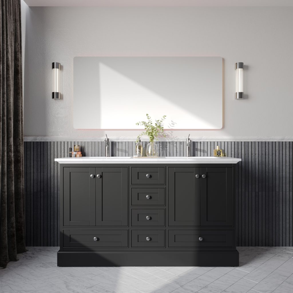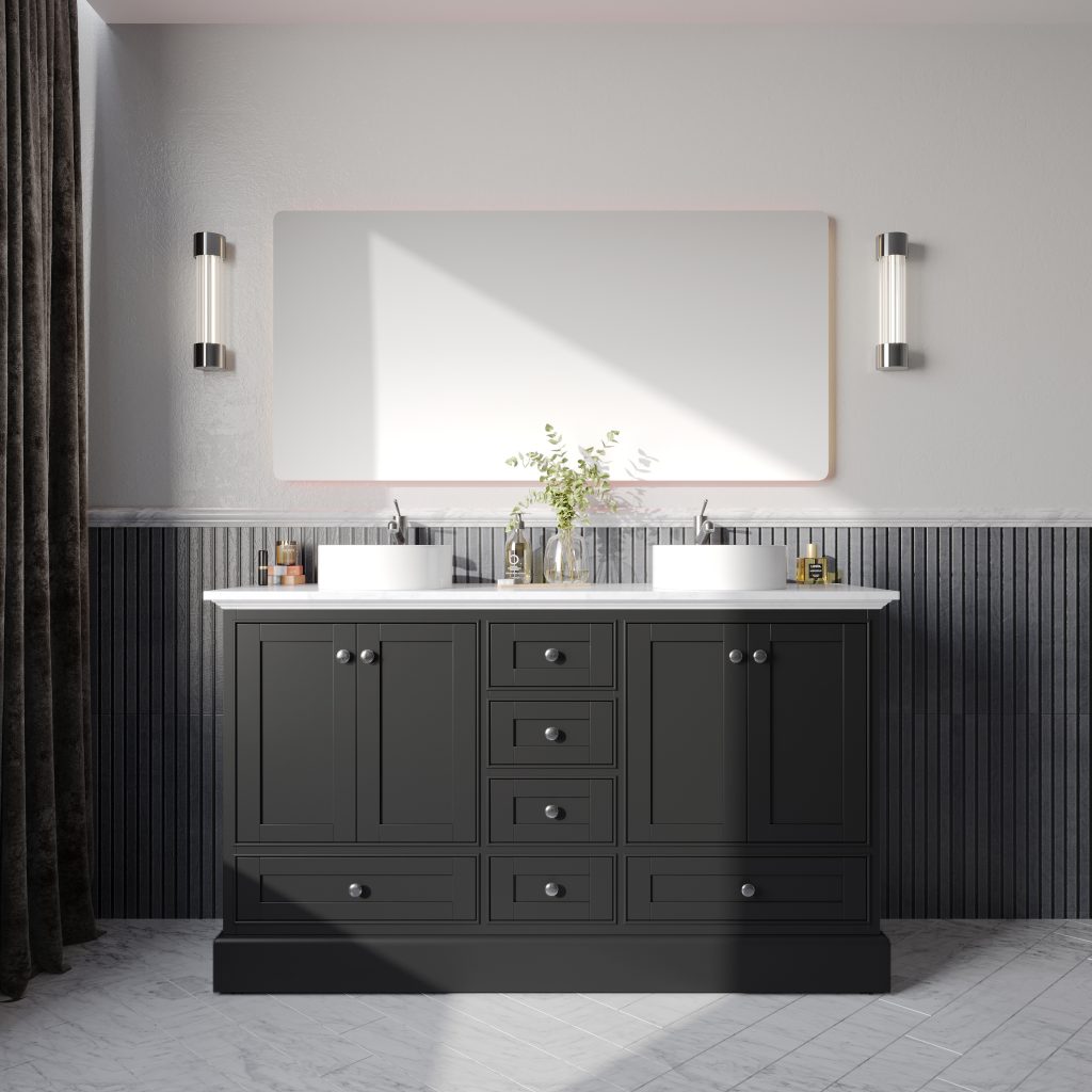 - Luxury Stone Top: Natural quartz countertop with your choice of dual ceramic under-mounted basins or two vessel basins. Each quartz top is unique, featuring naturally occurring variations that enhance its character.