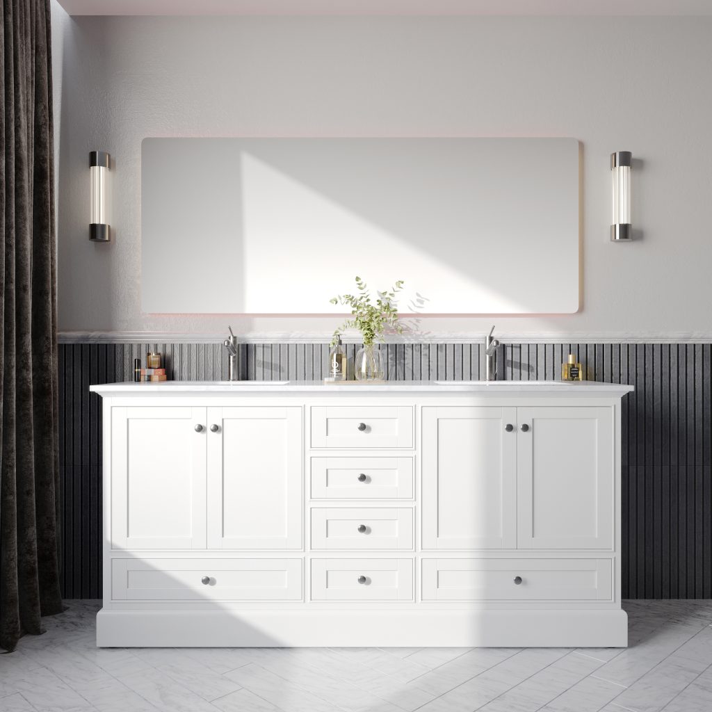 - Luxury Stone Top: Natural quartz countertop with your choice of dual ceramic under-mounted basins or two vessel basins. Each quartz top is unique, featuring naturally occurring variations that enhance its charm.