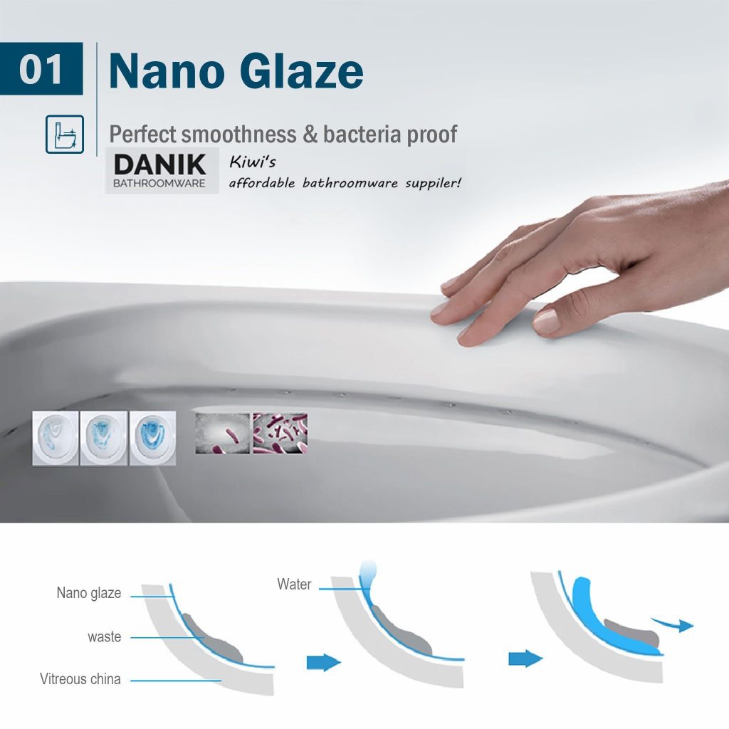 Boxed rim technology ensures even water distribution and a near-silent, splash-free flush. - Nano Glaze Technology