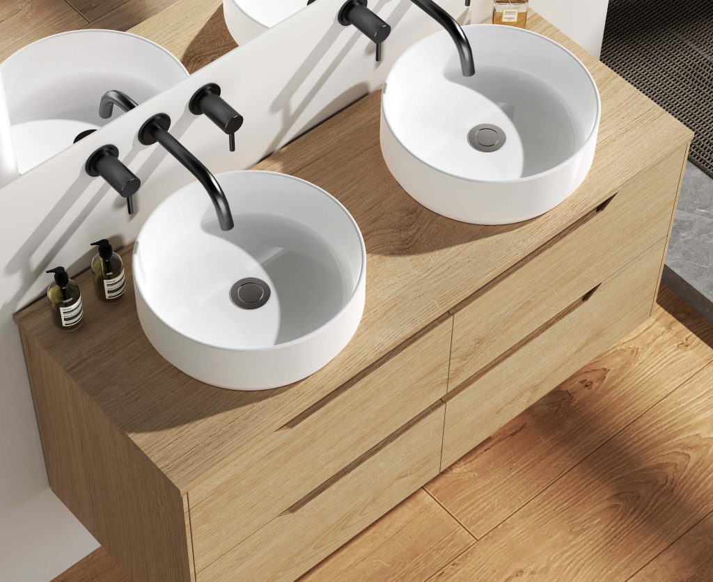 Sleek, seamless, and adaptable. The Wai 1200mm Timber Top Vanity features a seamless “box” design where the timber top sits perfectly flush with the cabinet for a clean, architectural look. Supplied with no pre-drilled holes, this vanity gives you the ultimate freedom to configure it as a luxurious Double Basin vanity, or a spacious Single Basin setup (centered or offset).