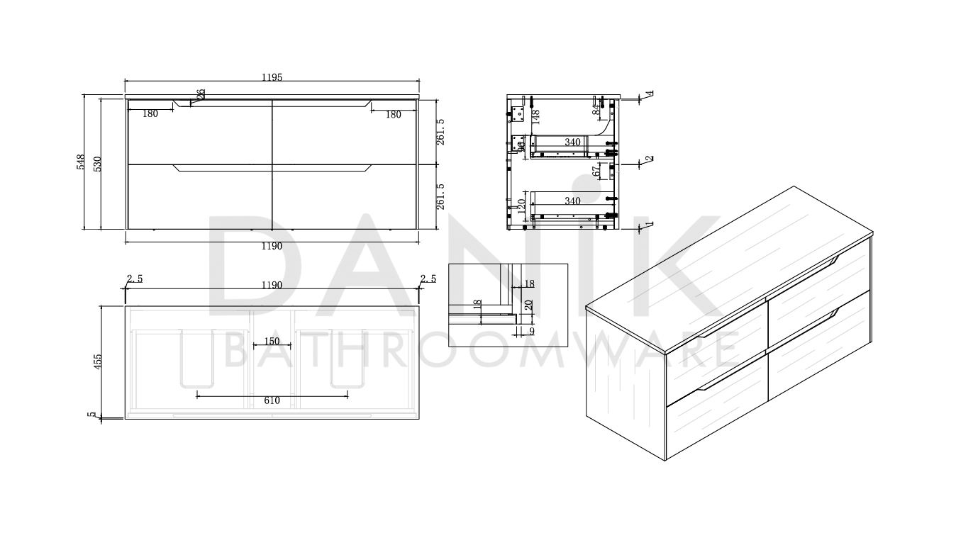 - Total Height: Approx. 548mm (Cabinet + Top) + 120mm Basin