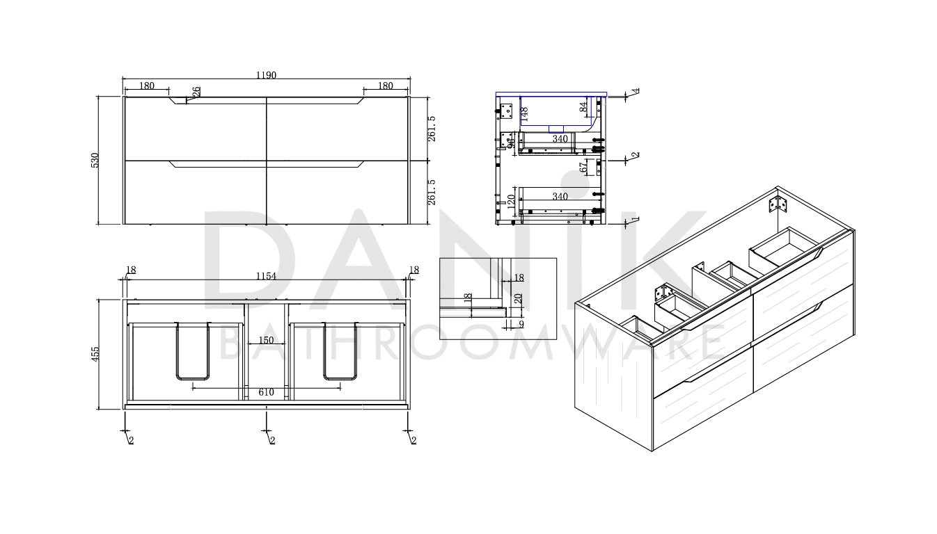 • Cabinet Dimensions: 1190mm (W) x 455mm (D) x 530mm (H)