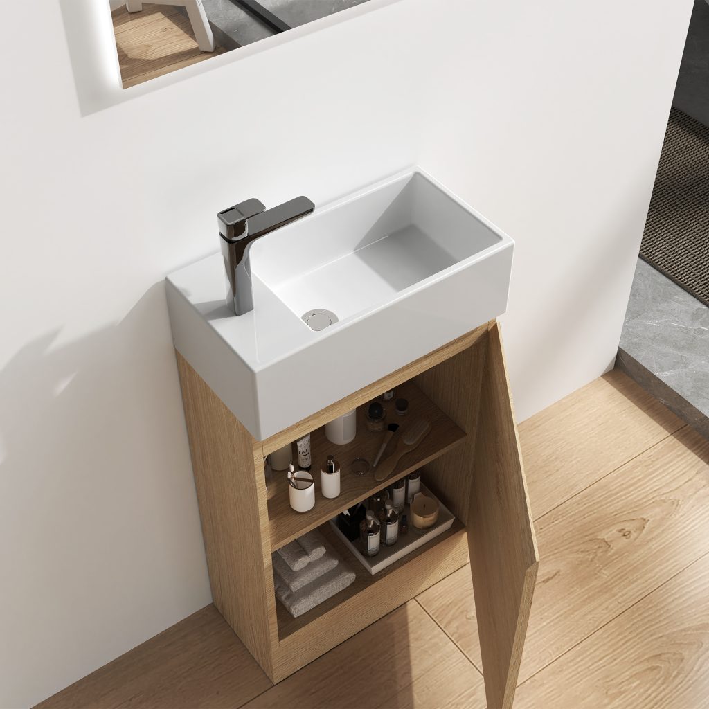 The ultimate space-saver for compact bathrooms. The Wai 480mm Floor-Standing Vanity combines a slim profile with a premium Honey Oak timber finish. Featuring a modern handle-less design, it offers essential storage and a durable ceramic basin without sacrificing floor space or style.