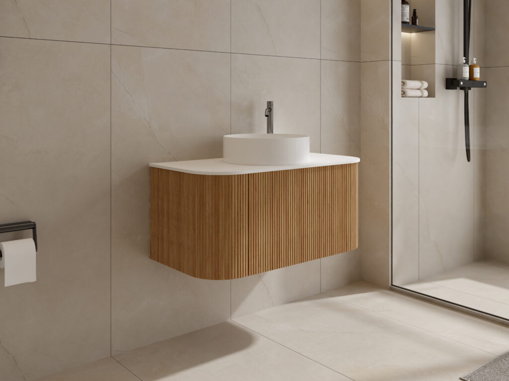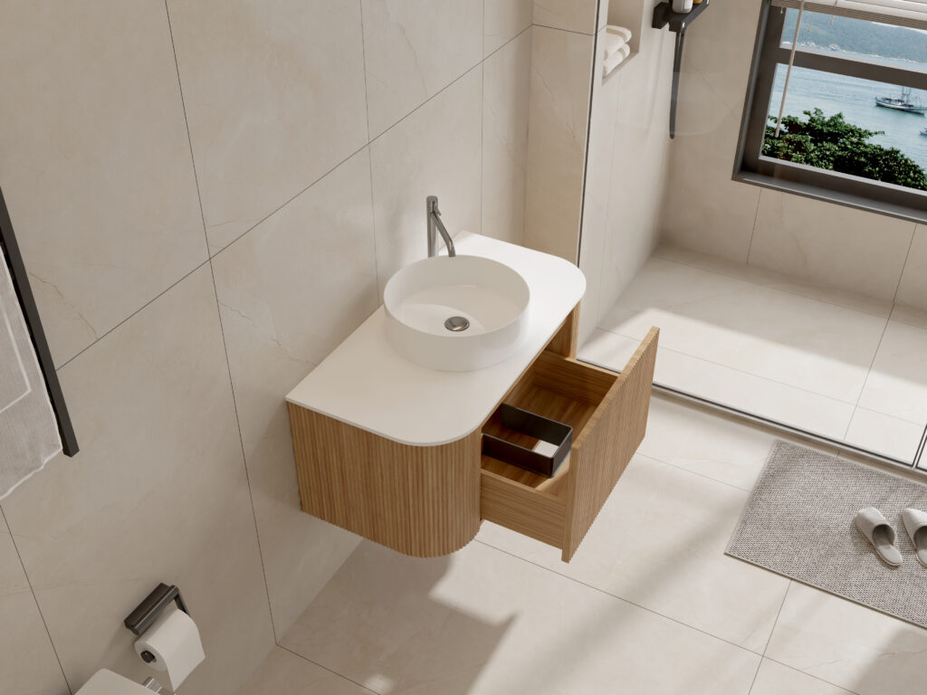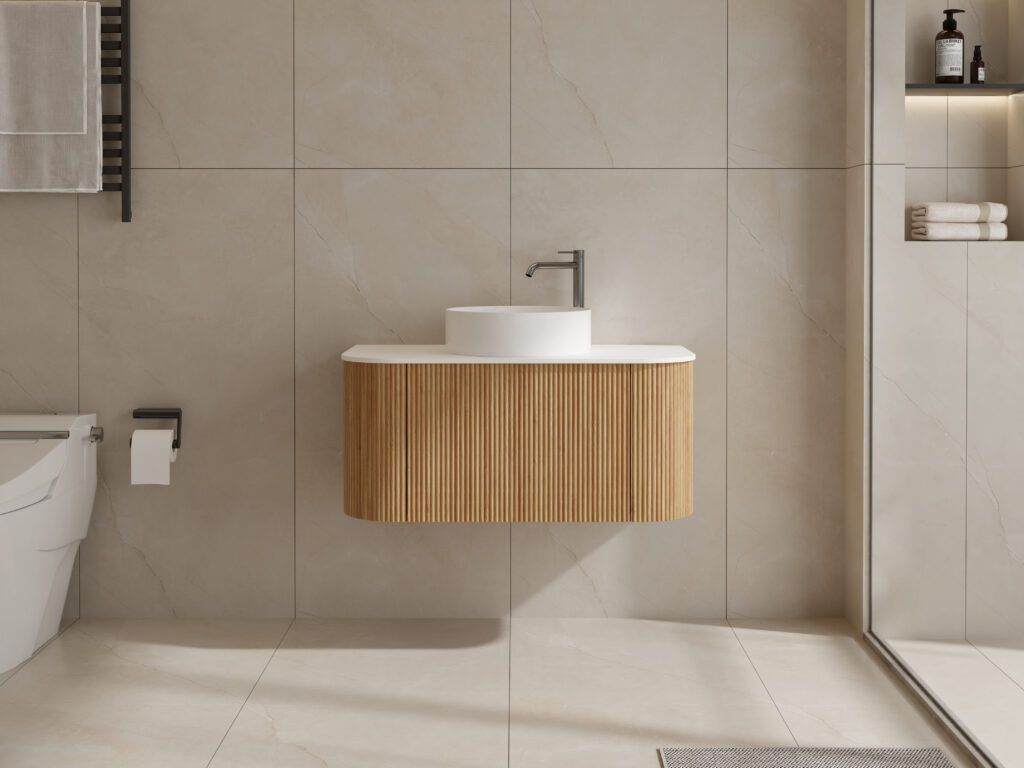 Yes, it comes with a connection for a single mixer tap and basin waste. The 900 mm wall-hung vanity for NZ is pre-drilled at the rear and underside for standard plumbing fittings. This is a setup that ensures a smooth installation and aligns precisely with the plumbing mounted upon the wall.
