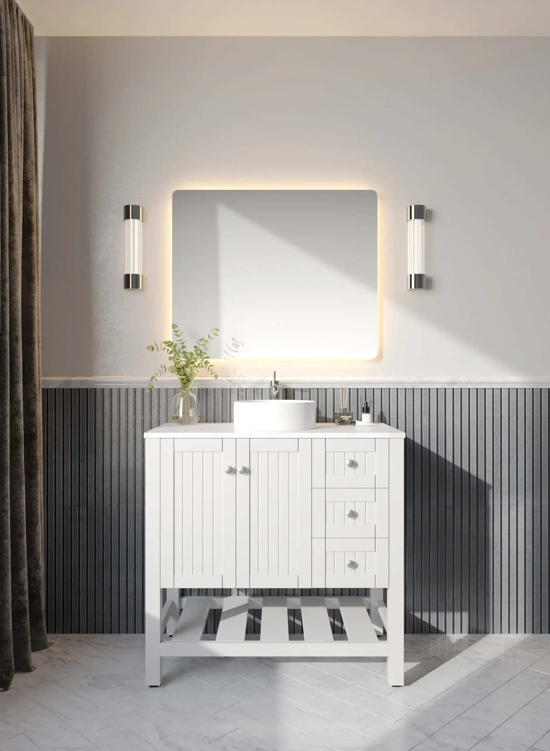 - Matte white porcelain countertop (12mm thick) with a single waste hole.