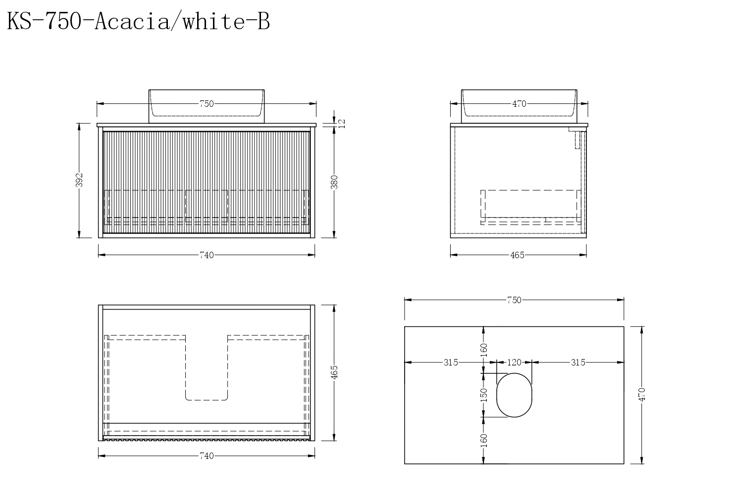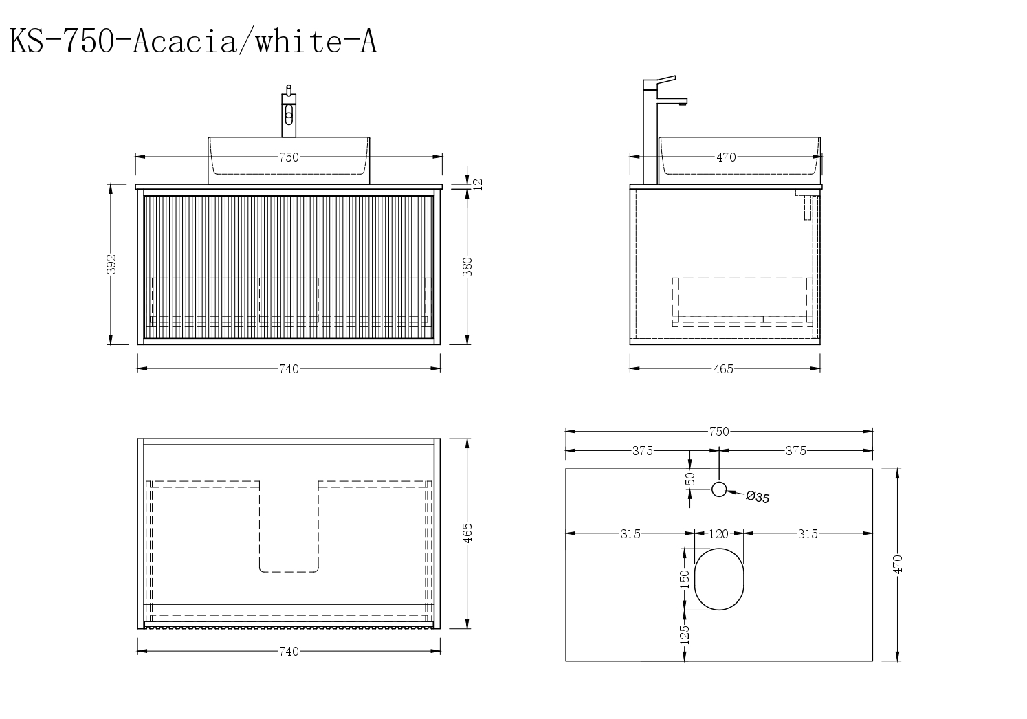 Vanity Cabinet Dimensions: 750W × 460D × 380H mm