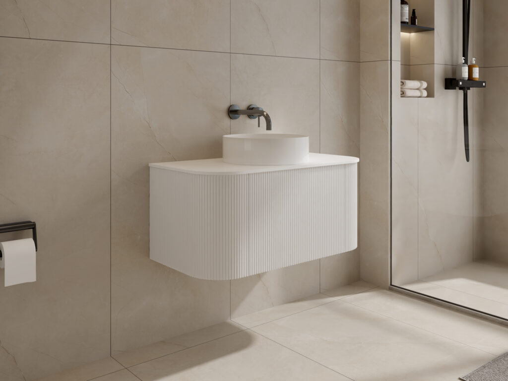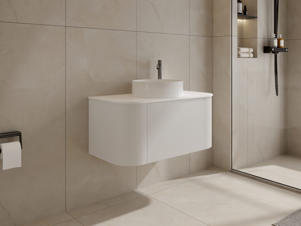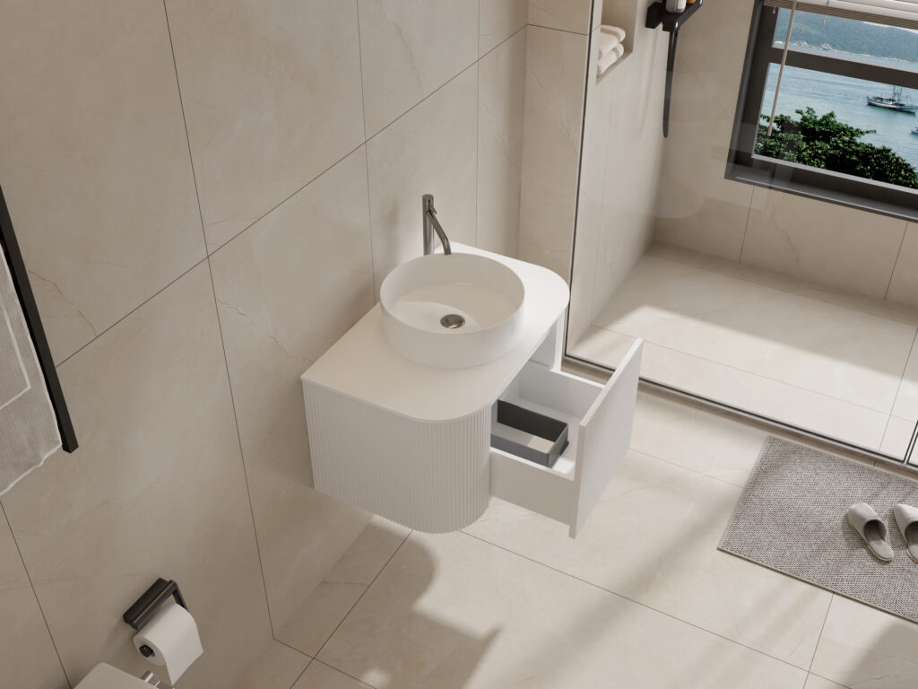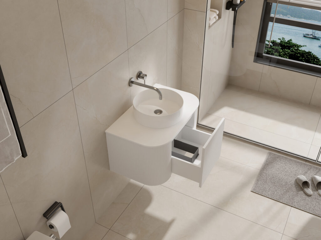 Sleek, space-conscious, and built for modern living. The Haven vanity brings together the same elegant fluted front and soft curved corners as the original design, now in a refined matte white finish. With a push-to-open drawer and a durable porcelain top, it’s a timeless piece that enhances any contemporary bathroom.