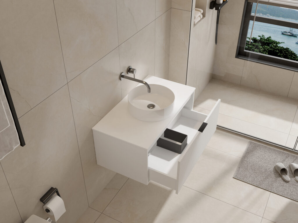 A clean, minimalist vanity with push-to-open drawers and a matte porcelain finish. The Aura vanity is built for modern bathrooms with style and simplicity in mind.