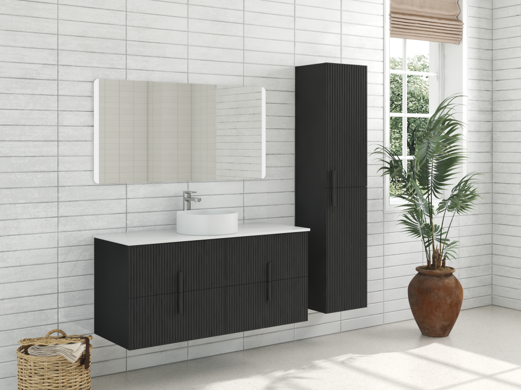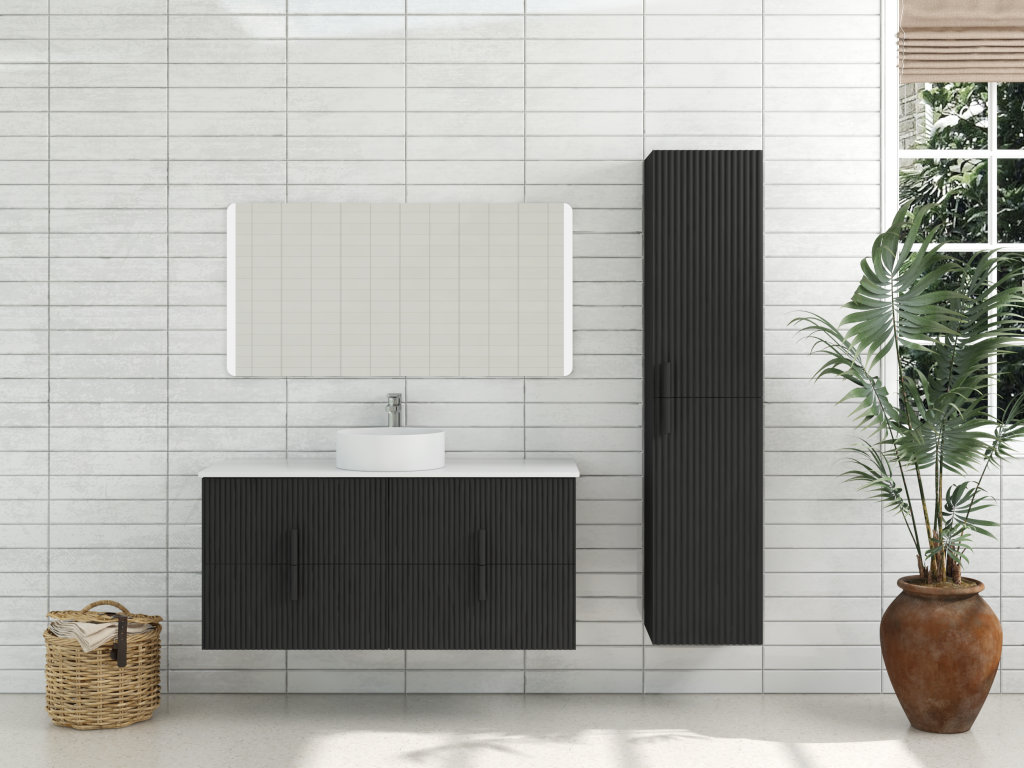 Elevate your bathroom with this sleek and functional wall-hung towel cabinet. Crafted with a sturdy plywood structure and finished with a stunning solid Black wood door front, this tall cabinet is designed to combine natural elegance with practical storage.